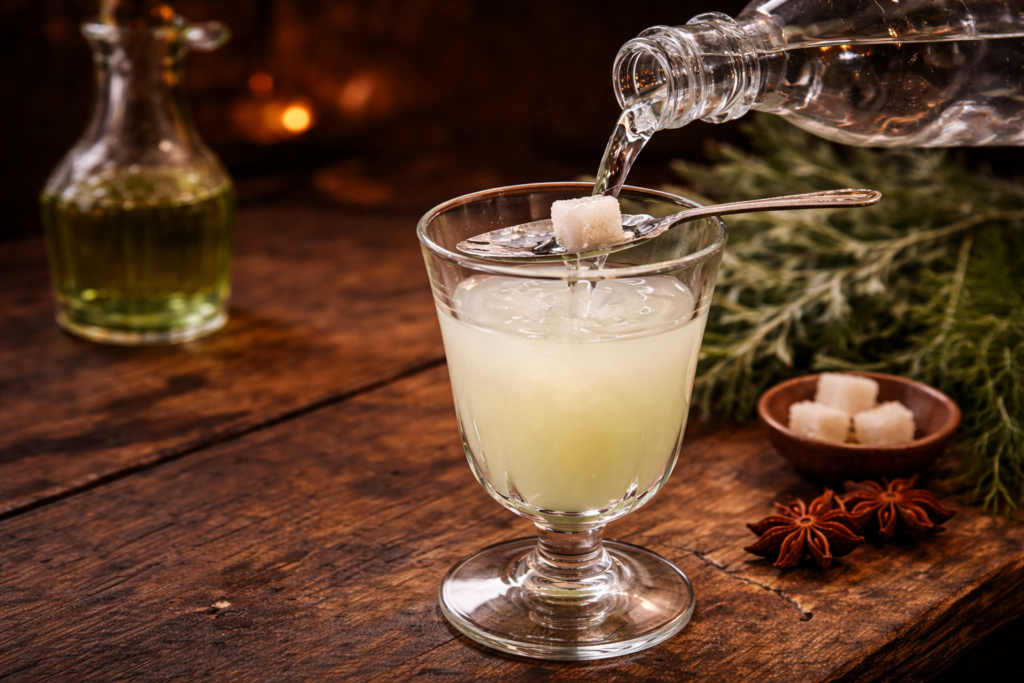 アブサンはそのまま飲むこともできますが、伝統的には水を加えて飲みます。